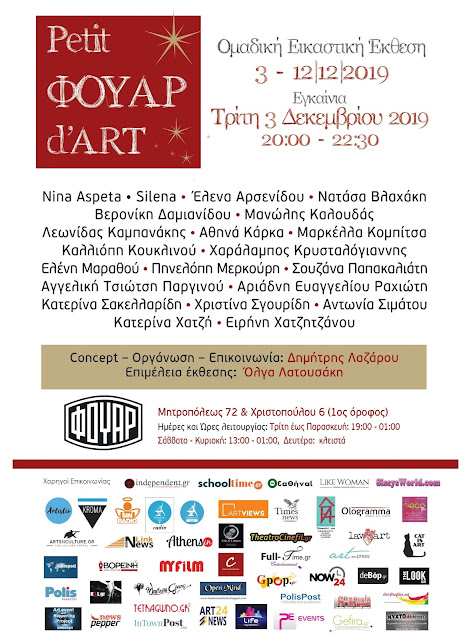 εγκαινιάζεται την Τρίτη, 3 Δεκεμβρίου 2019 στις ώρα 8μ.μ. – 10:30μ.μ. στον σύγχρονο πολυχώρο ΦΟΥΑΡ Μητροπόλεως 72 & Χριστοπούλου 6, 1ος όροφος.